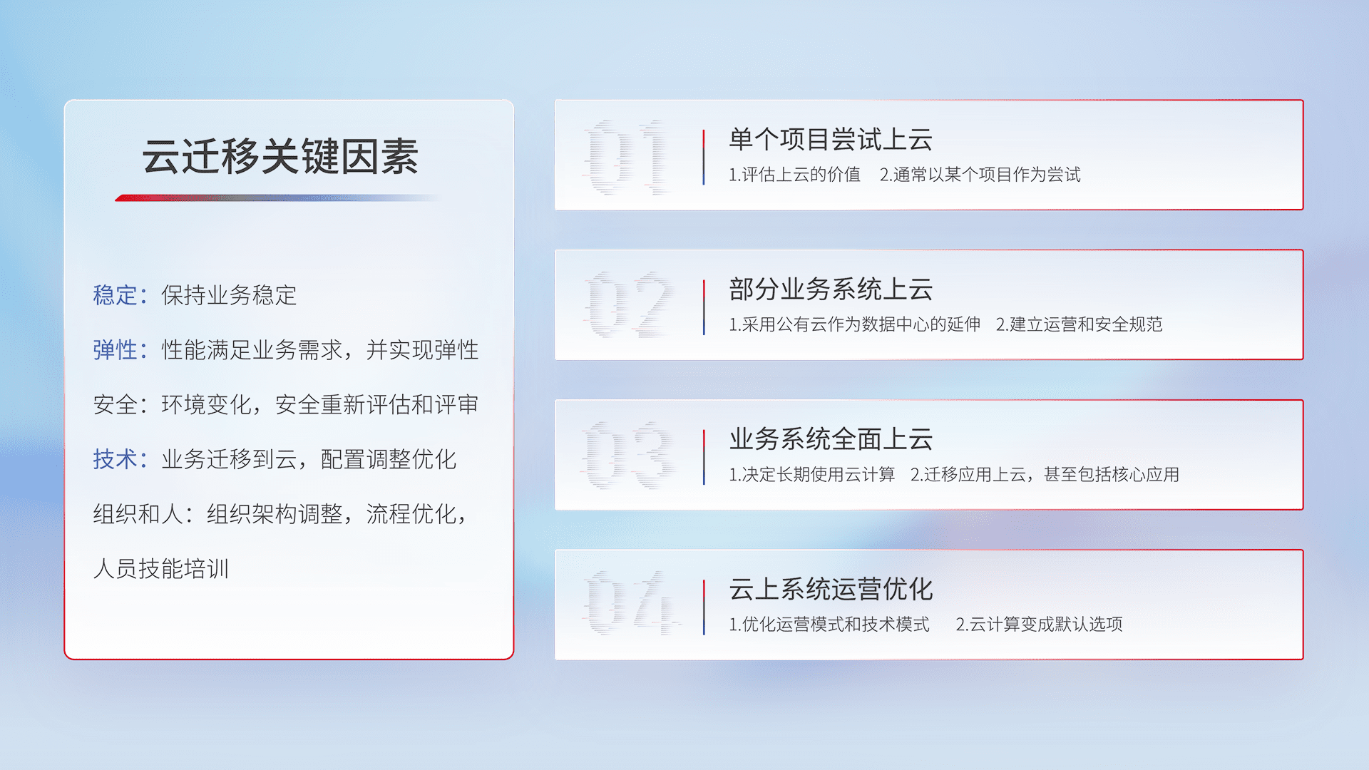 结合实际业务,,从规划设计、、、、云平台选型、、、云原生改造、、、数据迁移、、、、集成交付,,,迁移全过程为客户识别最佳上云路径,,,,做好风险识别管理,,,设计网络架构、、身份权限、、、、安全审计合规、、操作审计、、、、日志审计、、、监控告警策略、、、多站点容灾设计等,,,,对云上基础设施进行整体规划,,,提升IT治理水平,,以满足弹性、、、高可用、、、高性能的需求。。