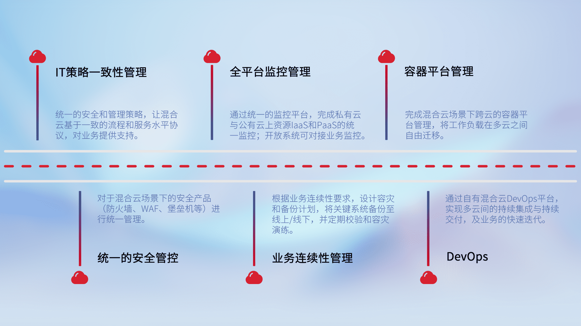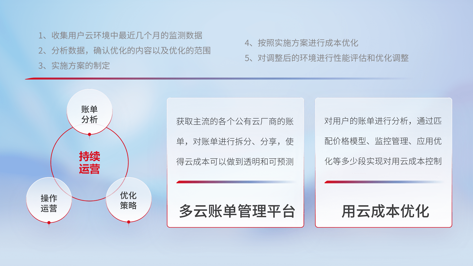 通过多云纳管,,,以统一的资源数据模型把客户的云资源进行抽象和封装,,,进而实现对多云资源的统一操作,,,,保障云资源管理的可靠性、、、稳定性与可用性。。。量身定制化运维内容,,配置、、、开发运维、、、补丁管理、、、备份、、、监控、、、、认证和访问管理、、、、审计和日常巡检等,,,,保障在用云过程中的可靠度,,,稳定度以及高可用率。。。。