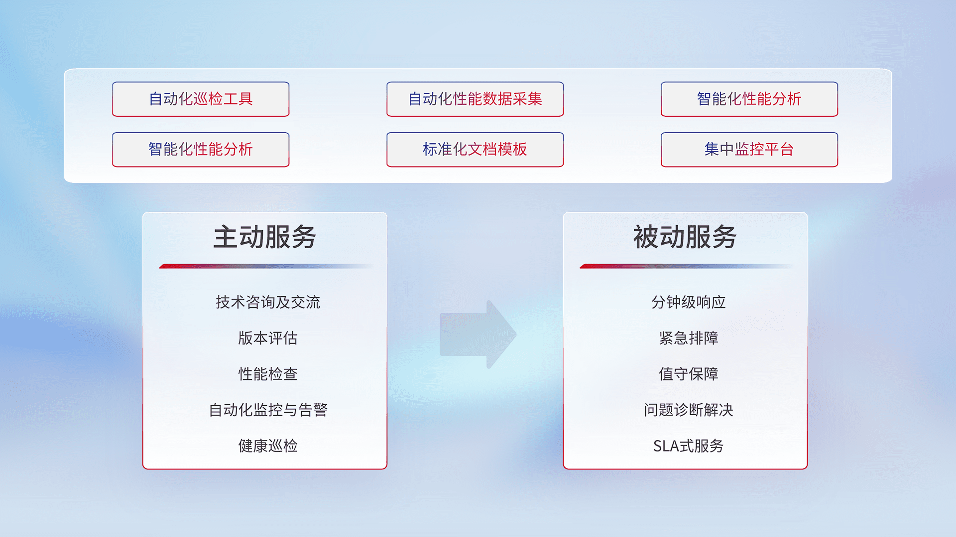 智能化工具和标准化文档,,保障服务质量,,,,提供主动服务(包含技术咨询、、版本评估、、性能检查、、、自动化监控与告警、、、健康巡检)和被动服务包含(分钟级响应、、紧急排障、、、、值守保障、、、、问题诊断解决、、、SLA服务)。。