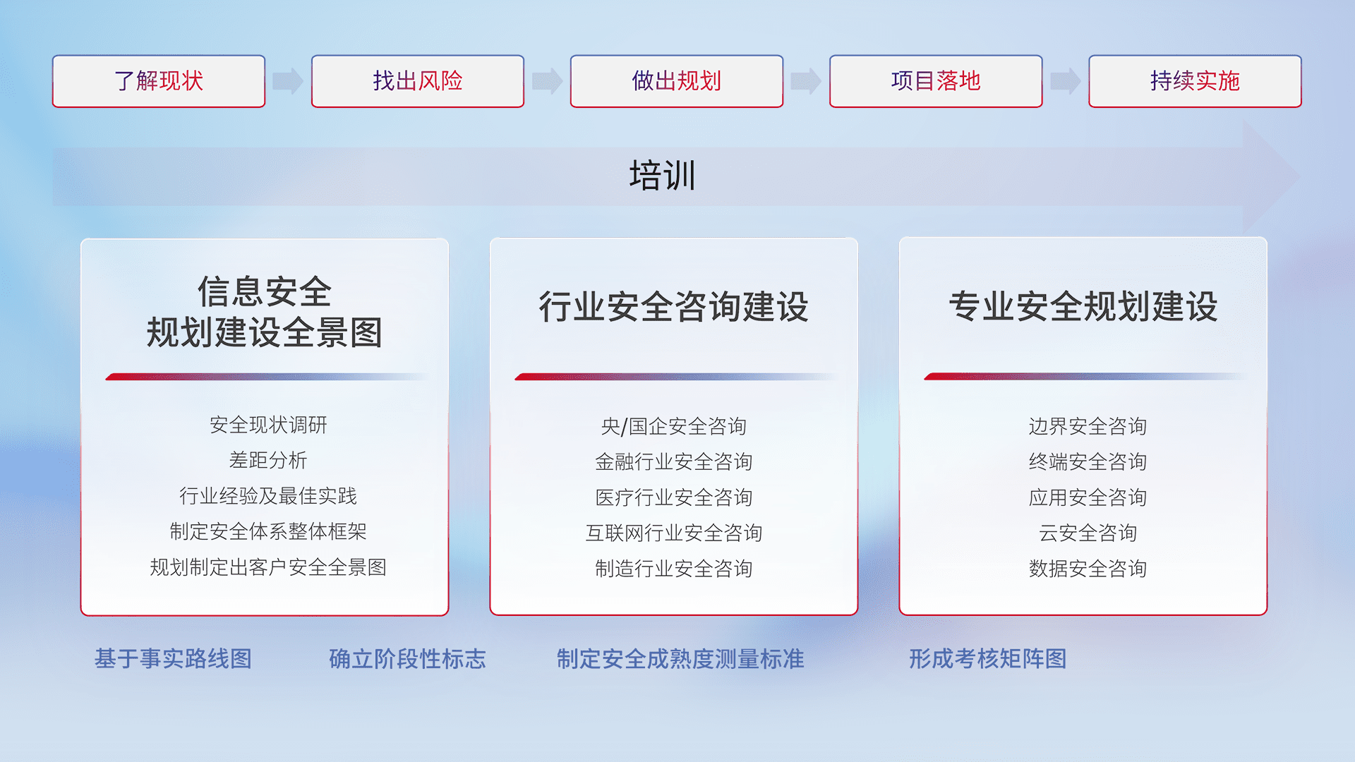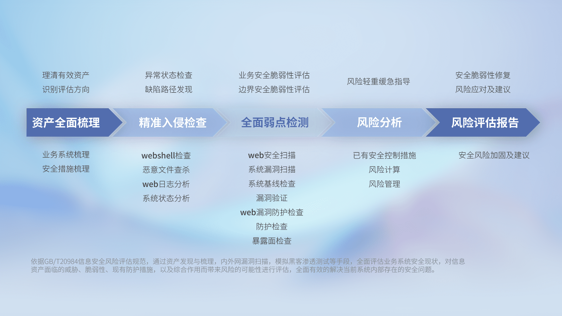 针对客户行业特性,,以专业的安全服务+多厂商联合解决方案提供专属的一站式安全管理服务,,帮助客户全面感知网络空间威胁,,基于识别、、、、检测、、、分析、、、防护、、监测、、、响应的服务理论模型,,从方案咨询、、、集成交付、、、、评估验证、、优化加固、、运维运营,,致力于为客户提供完整的闭环管理式安全服务。。。。以实战经验为客户打造高抵御风险的安全体系,,,,帮助客户发现威胁、、、对抗威胁、、、、处置威胁,,不断积累安全对抗能力,,,持续保障数字化安全。。。。