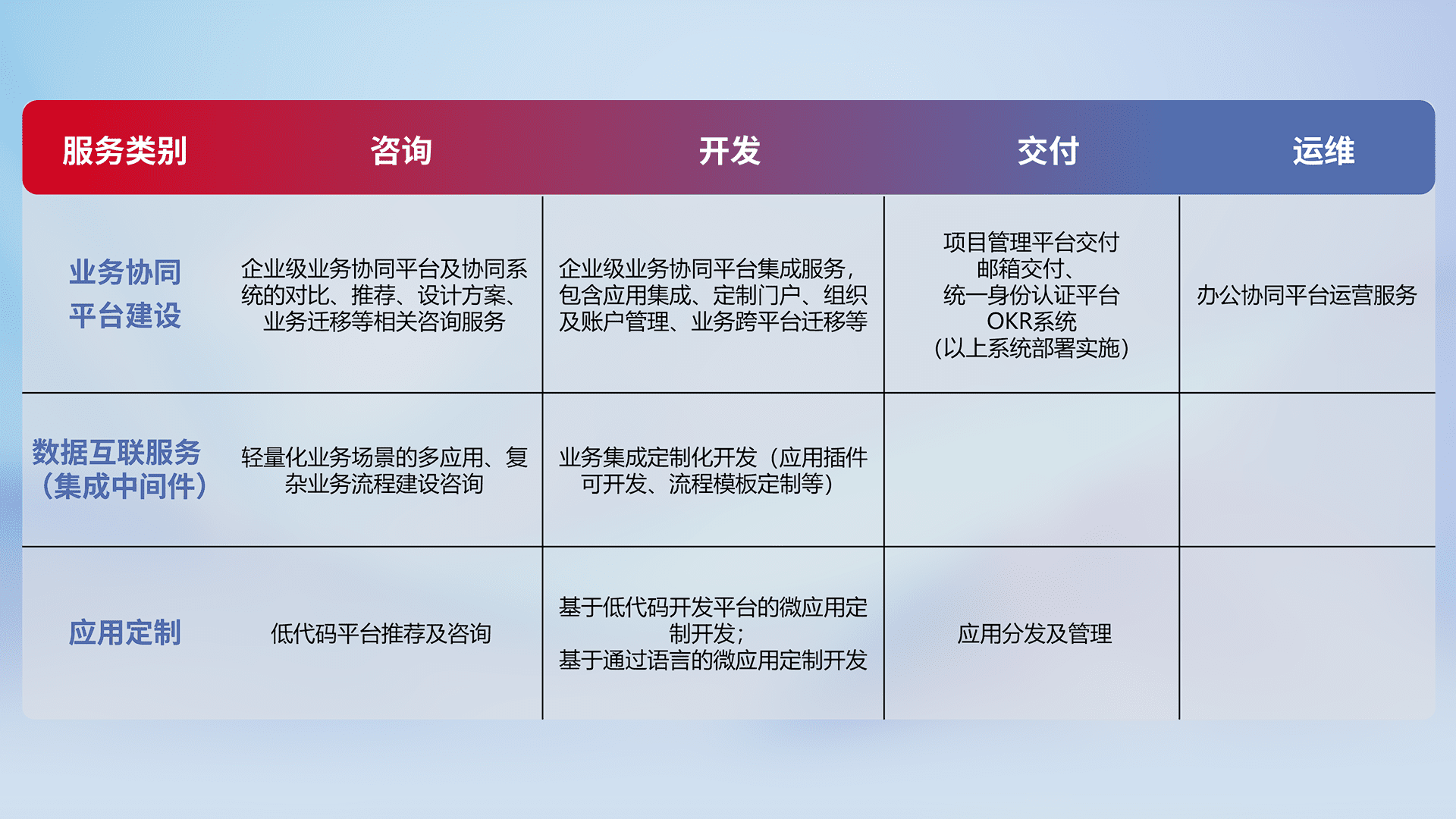针对钉钉、、、、企微、、IDaas等平台级产品提供产品的规划、、、方案、、、交付、、定制化开发等服务,,实现如统一协同办公、、、智能客户服务、、、混合会议管理、、、智能数据查询、、、等业务场景,,实现数字化转型。。。